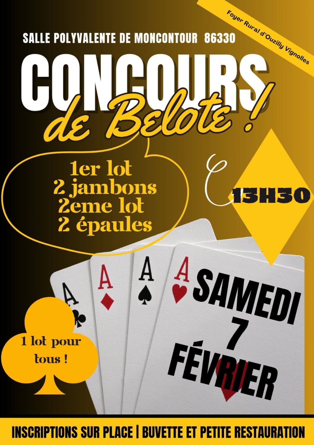L’association Foyer Rural d’Ouzilly-Vignolles organise un concours de belote le samedi 07 février à 13h30 à la salle polyvalente de Moncontour.